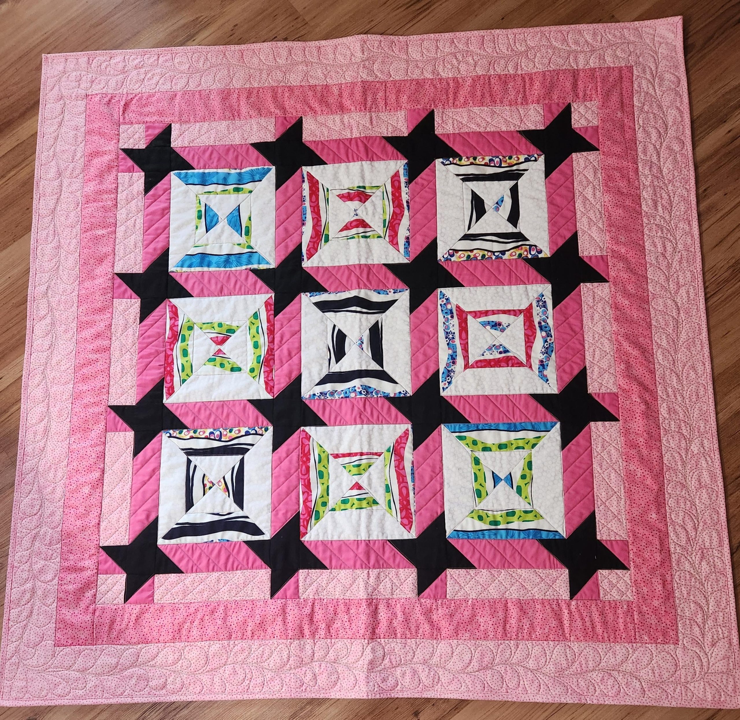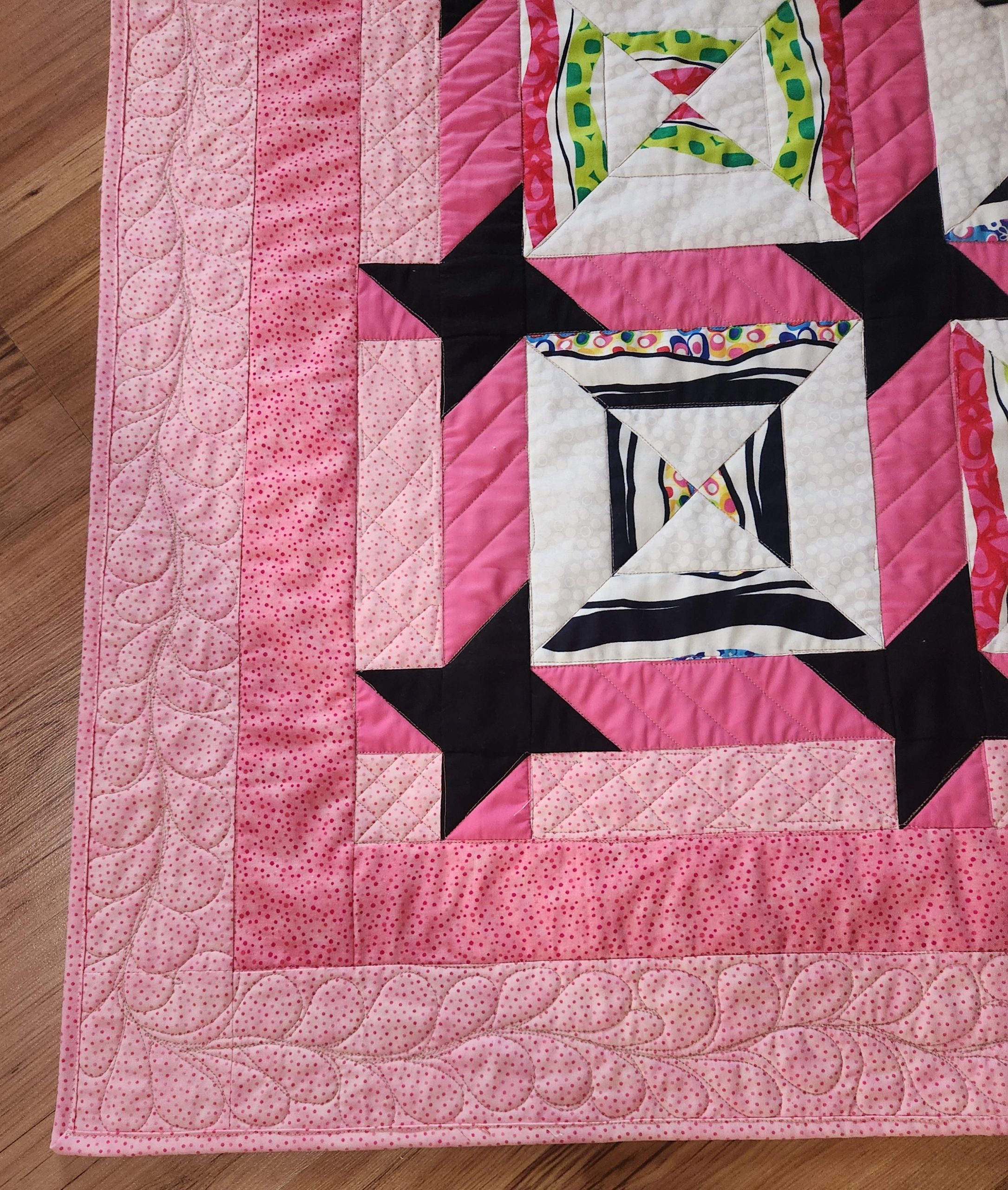 Quilt top: 100% cotton fabrics in bright pinks, white background and black stars.